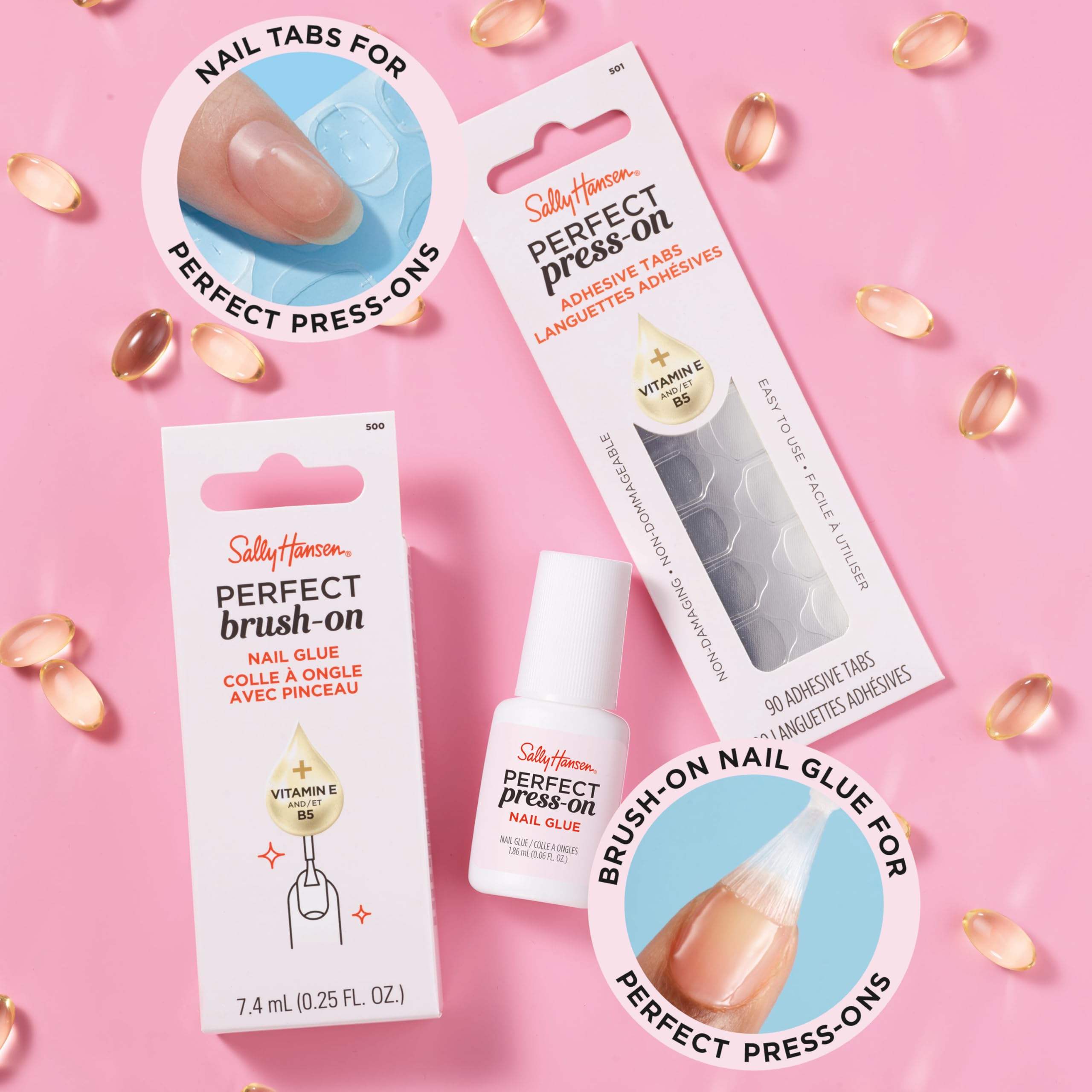 - The Sally Hansen nail glue is infused with Vitamin E and B5